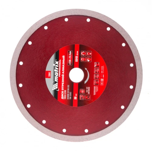 • Тонкий сплошной алмазный диск Matrix 230 х 25,4 мм 730847 обеспечивает мокрое резание плотных материалов: керамогранита, керамической и кафельной плитки, мрамора, натурального и искусственного камня.