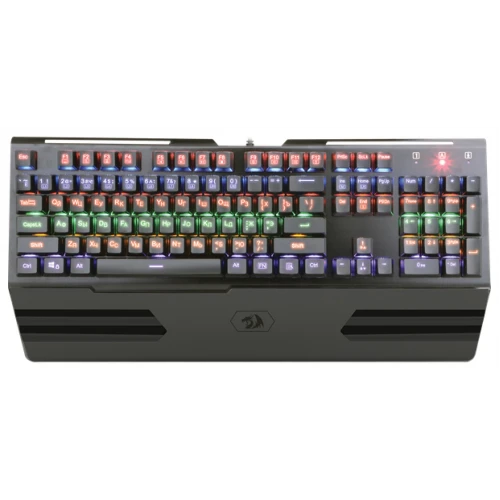 Redragon Hara - отличное решение механической клавиатуры со стальной крышкой и подсветкой. Подставка под руки упрощает долговременную работу и придает привлекательный внешний вид. Мультимедийные кнопки реализованы через FN функцию, как и переключение режимов подсветки, что экономит место на клавиатуре.