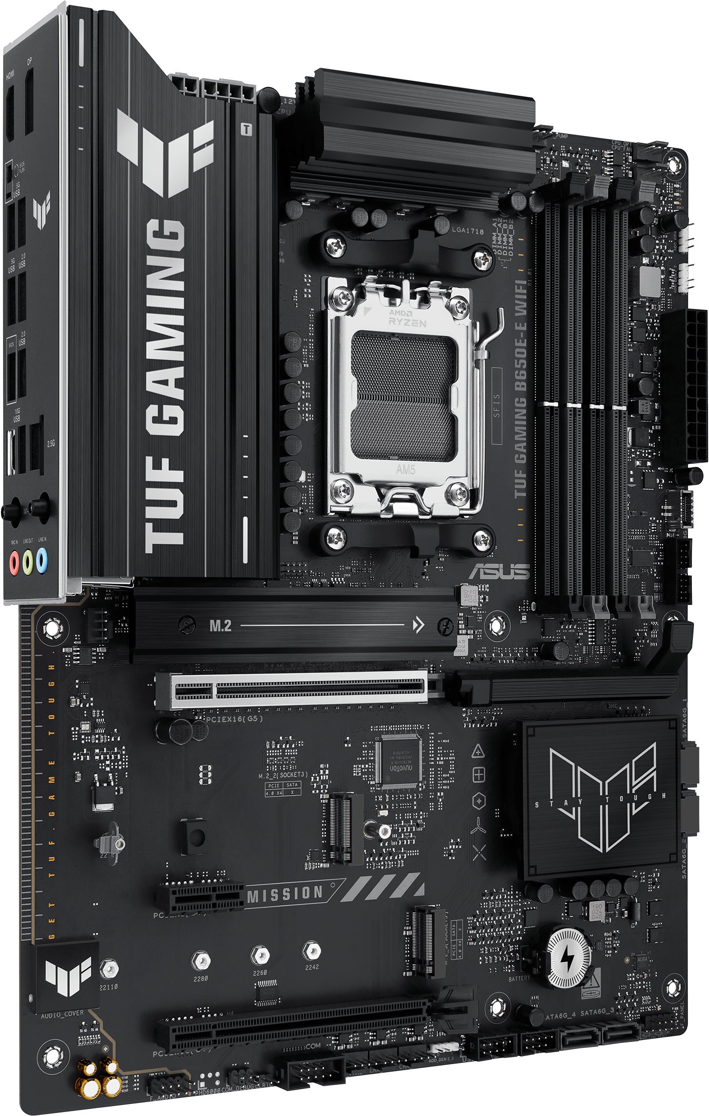 ASUS TUF GAMING B650E-E WIFI берет все основные элементы новейшего сокета AM5 для процессоров AMD Ryzen™ для настольных ПК и объединяет их с готовыми к игре функциями и проверенной долговечностью.