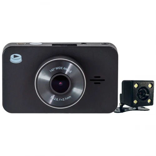 Автомобильный двухканальный видеорегистратор высокого разрешения с дополнительной камерой обеспечивает полноценный контроль дорожной ситуации как спереди, так и позади авто.